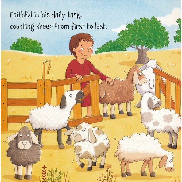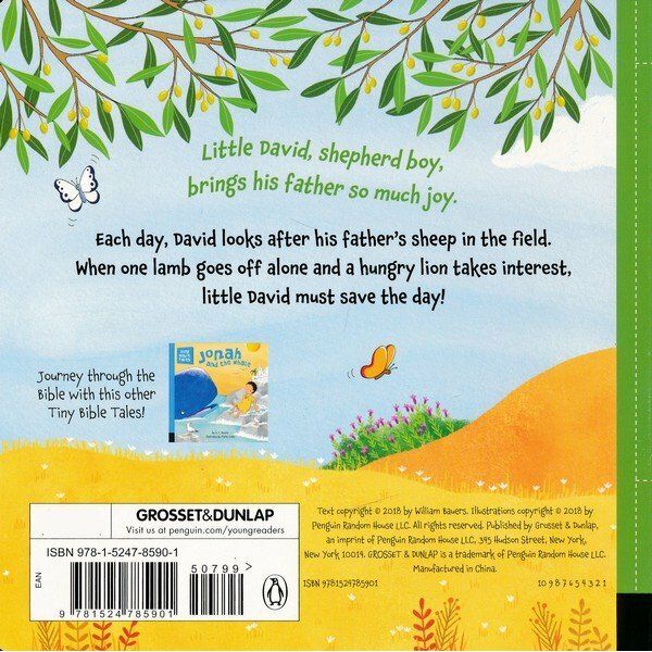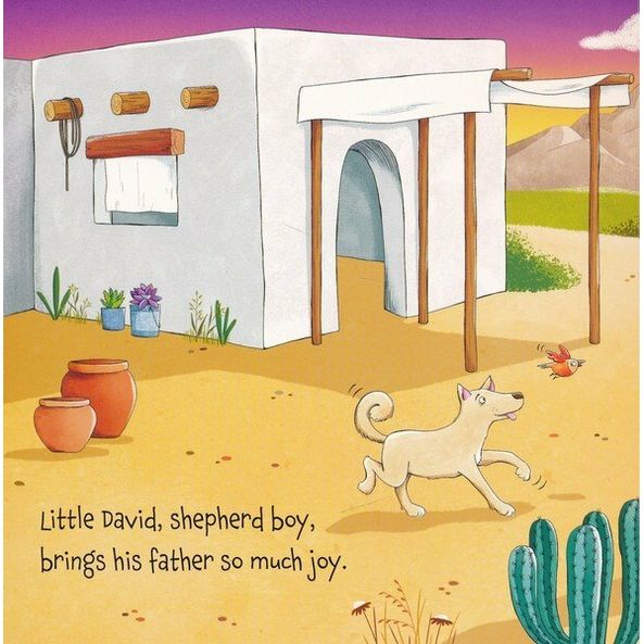 Tiny Bible Tales, a new series of board books, shares the stories of the Bible's bravest heroes. With gentle, rhyming text and gorgeous illustrations, this book tells the tale of David saving a lost lamb from a hungry lion. Each day, David leads his flock of sheep out into the hills. When one lamb wanders from the rest and a hungry lion takes interest, David rushes to its aid, bringing the young sheep back to safety. This board book combines quiet, rhyming text with simple and colorful art to tell one of the Bible's most treasured stories.